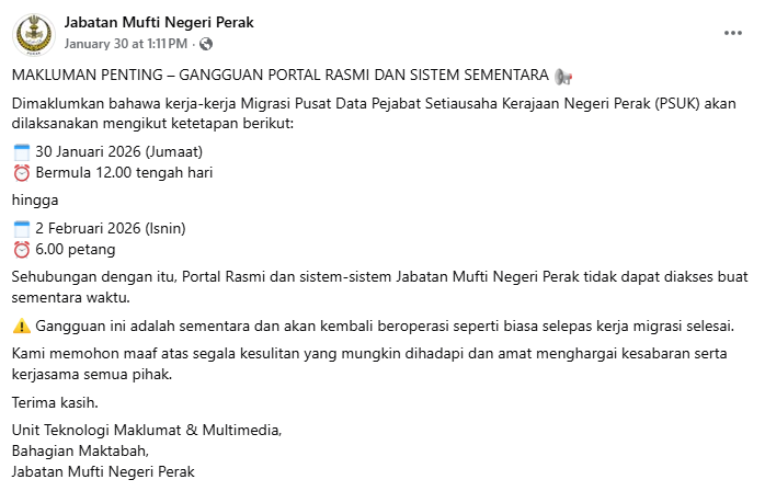 Facebook 6 1 Mac 2020 Penyelenggaraan server laman web dan aplikasi Jabatan Mufti Negeri Perak.