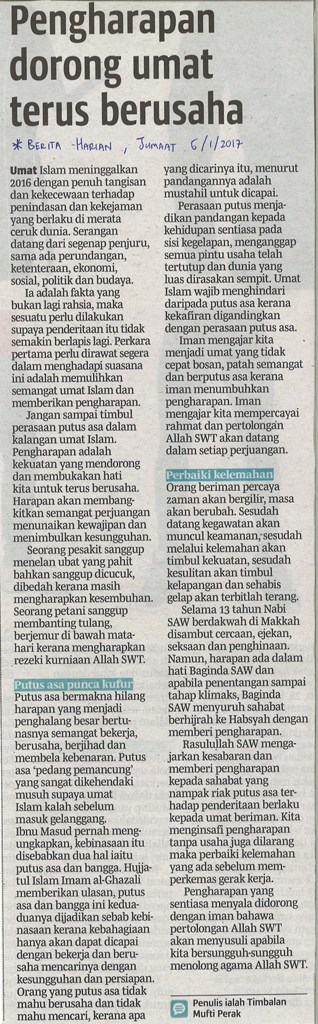 "Pengharapan dorong umat terus berusaha" - Berita Harian, Jumaat 6 Januari 2017