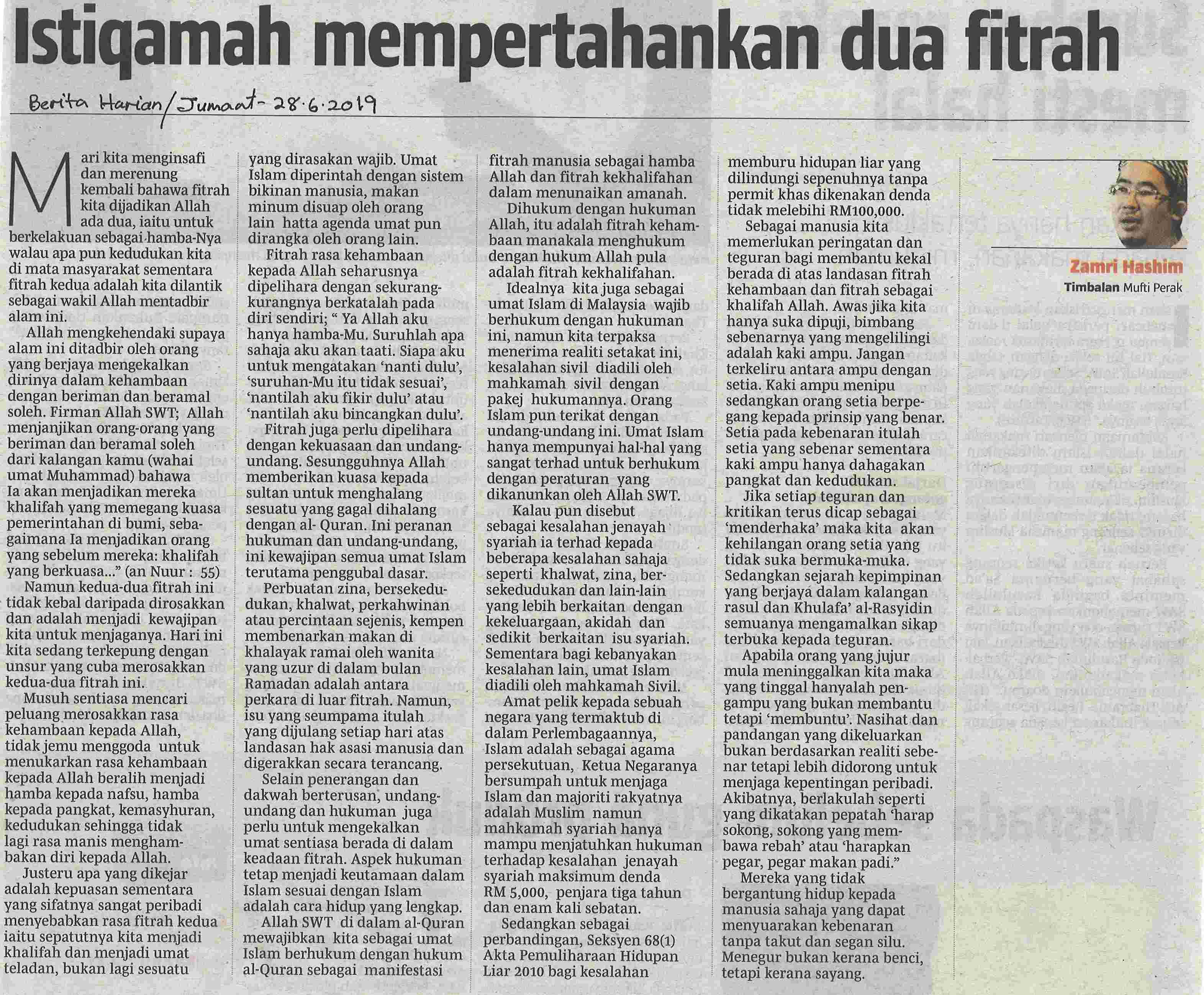 Istiqamah Mempertahan Dua Fitrah - Berita Harian, Jumaat 28 Jun 2019