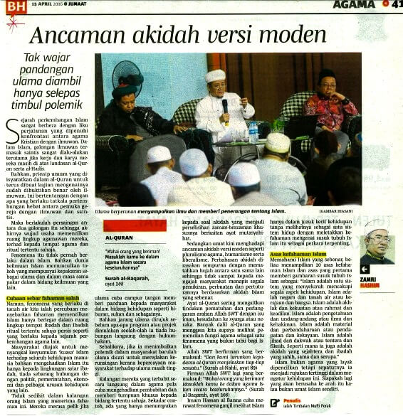 | 2 | 15/04/2016 (Jumaat) | Berita Harian | "Ancaman Aqidah Versi Moden" |