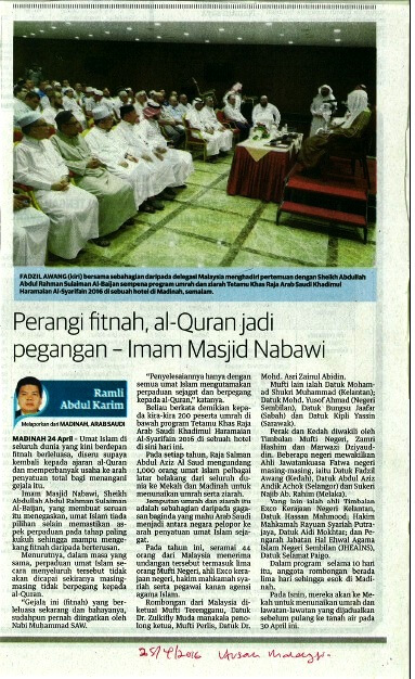 | 1 | 25/04/2016 (Isnin) | Utusan Malaysia | "Perangi Fitnah, Al-Quran Jadi Pegangan" |