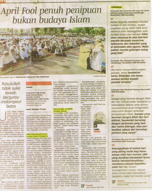 | 3 | 01/04/2016 (Jumaat) | Berita Harian | "April Fool Penuh Penipuan Bukan Budaya Islam" |