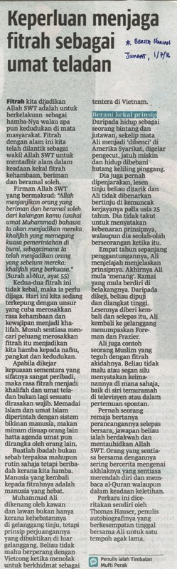 | 3 | 01/07/2016 (Jumaat) | Berita Harian | "Keperluan menjaga fitrah sebagai umat teladan" |