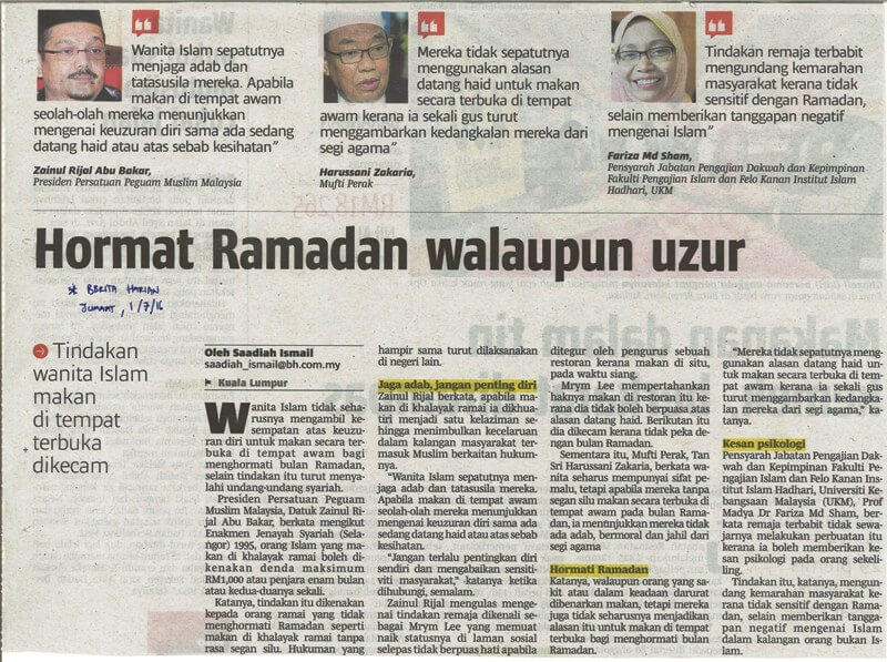 | 1 | 01/07/2016 (Jumaat) | Berita Harian | "Hormat Ramadan walaupun uzur" |