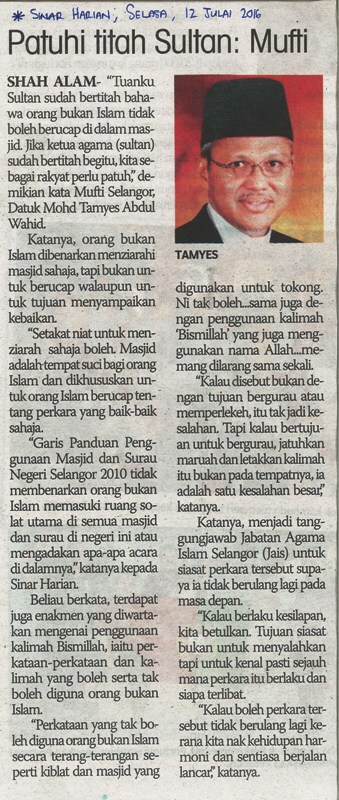 | 5 | 12/07/2016 (Selasa) | Sinar Harian | "Patuhi titah Sultan : Mufti" |