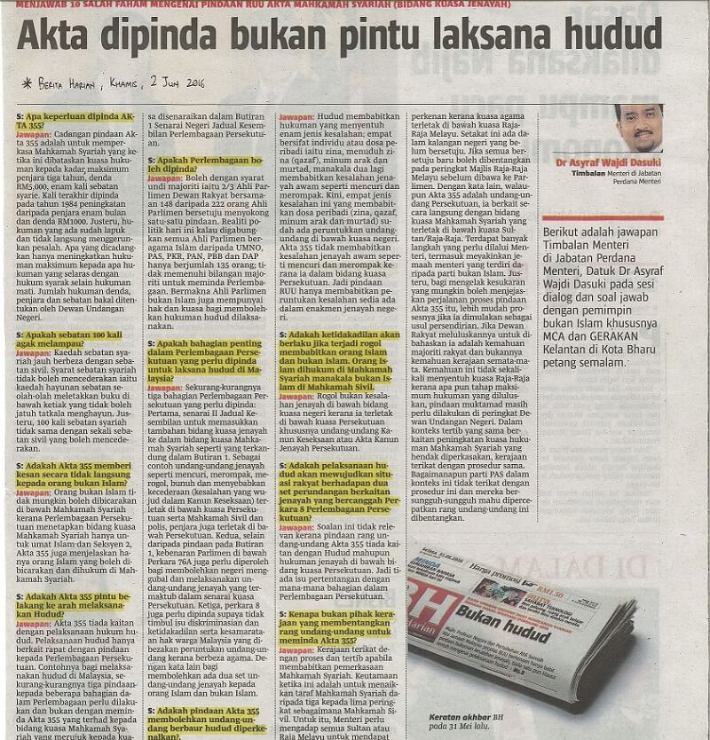| 4 | 02/06/2016 (Khamis) | Berita Harian | "Akta dipinda bukan pintu laksana hudud" |