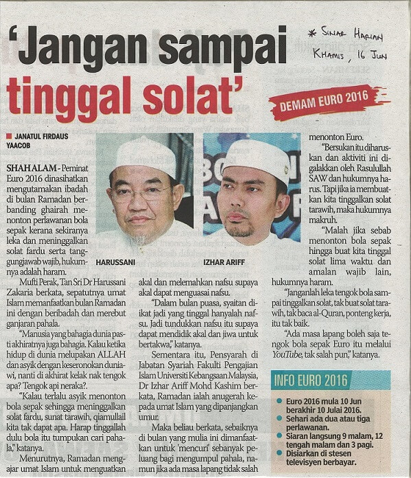 | 2 | 16/06/2016 (Khamis) | Sinar Harian | "Jangan sampai tinggal solat" |