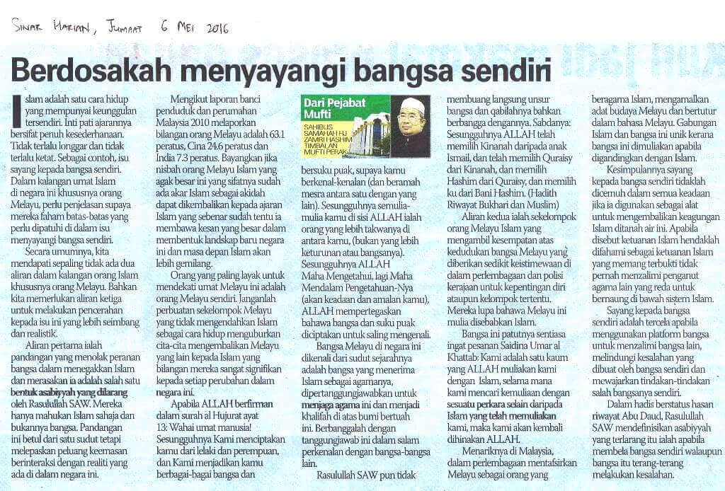 | 4 | 06/05/2016 (Jumaat) | Sinar Harian | "Berdosakah Menyayangi Bangsa Sendiri" |