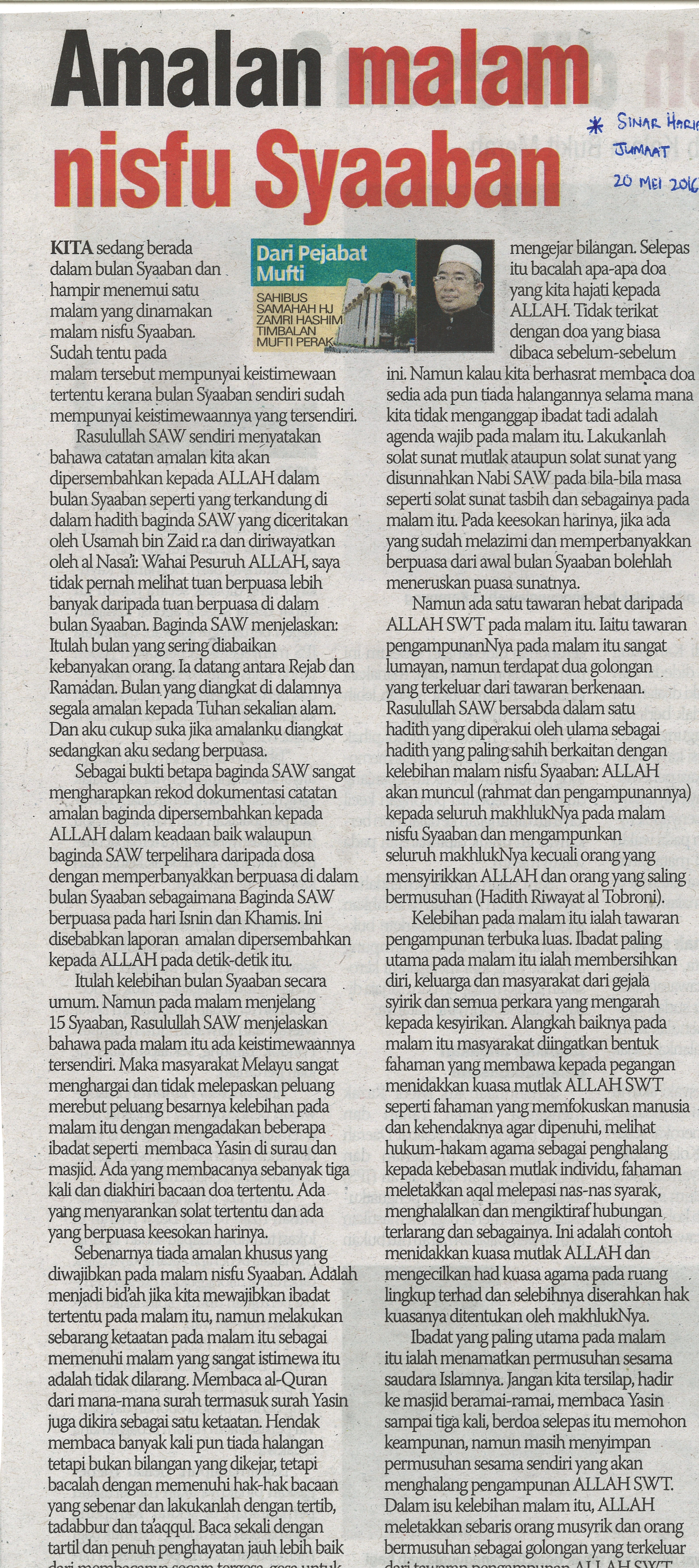 | 3 | 20/05/2016 (Jumaat) | Sinar Harian | "Amalan Malam Nisfu Syaaban" |