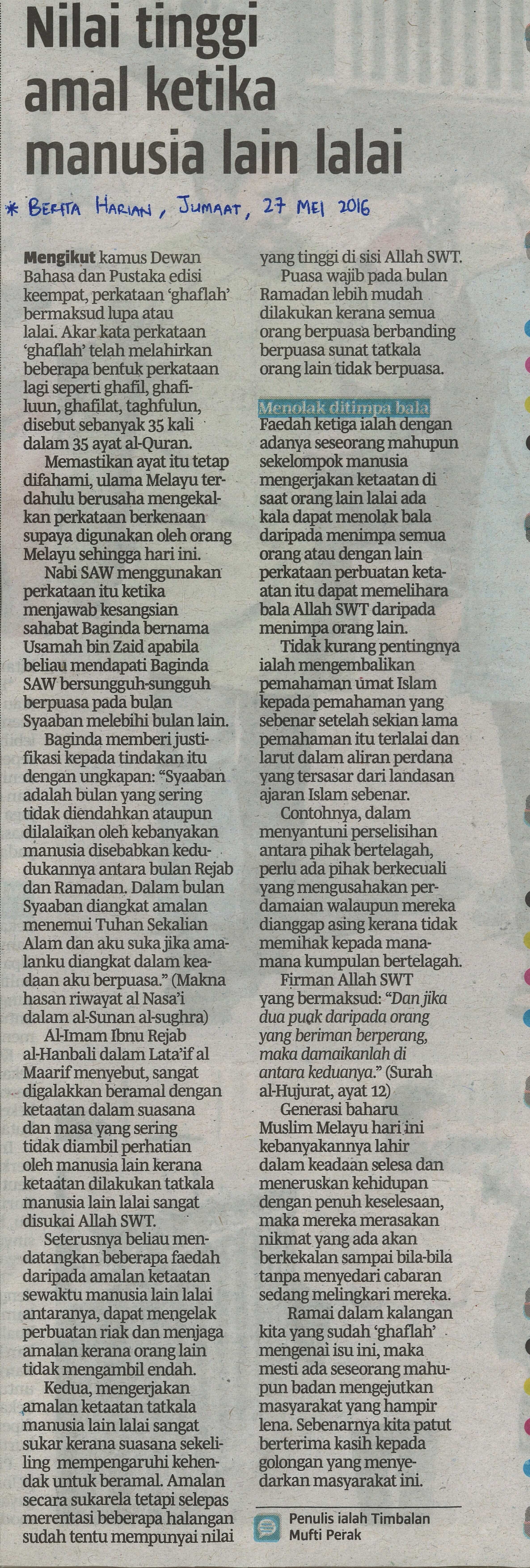 | 2 | 27/05/2016 (Jumaat) | Berita Harian | "Nilai Tinggi Amal Ketika Manusia Lain Lalai" |