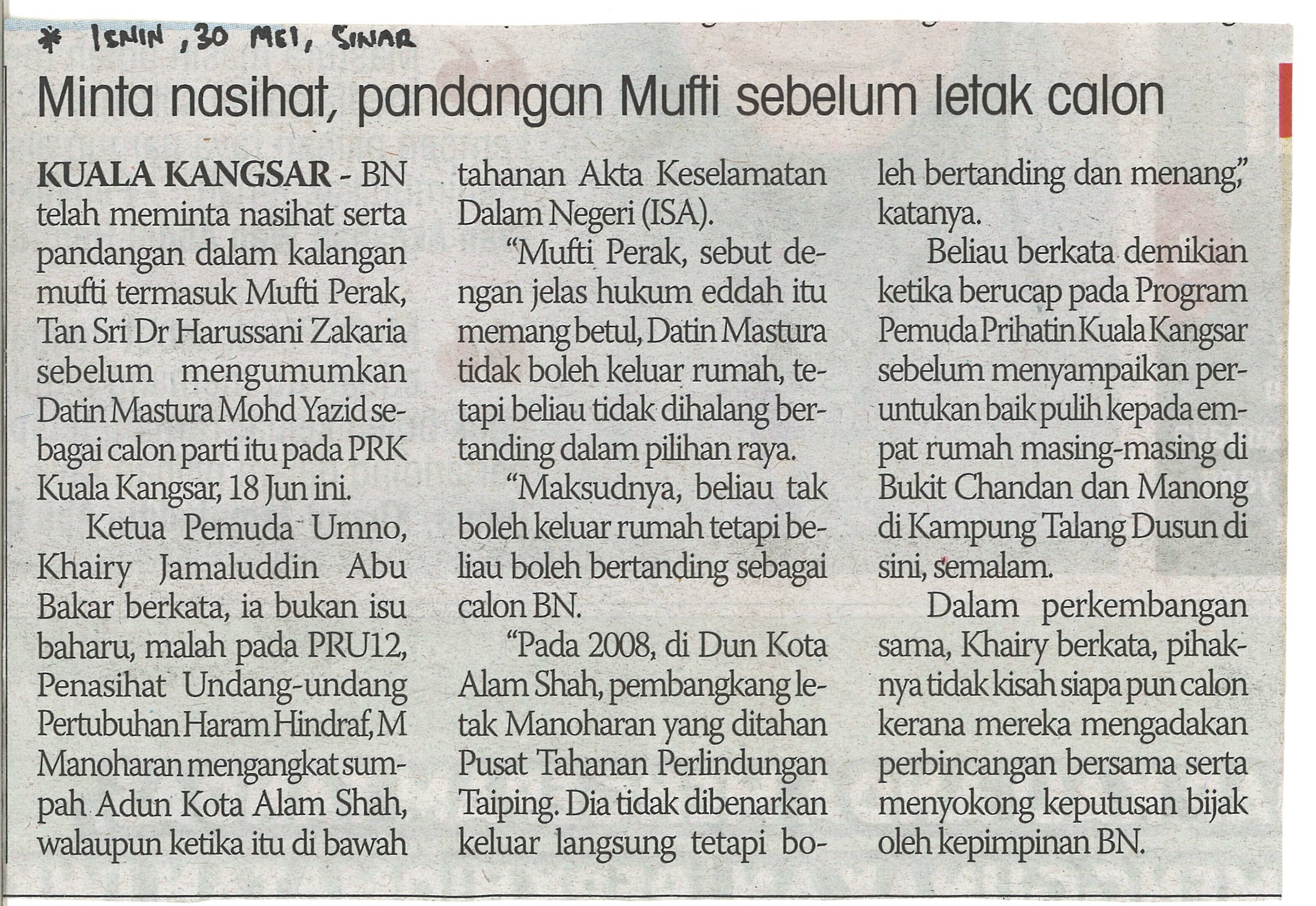| 1 | 30/05/2016 (Isnin) | Sinar Harian | "Minta Nasihat, Pandangan Mufti Sebelum Letak Calon" |