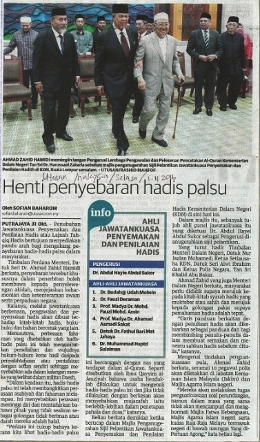 | 1 | 01/11/2016 (Selasa) | Utusan Malaysia | "Henti Penyebaran Hadis Palsu" |