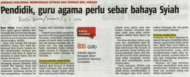 | 2 | 03/11/2016 (Khamis) | Berita Harian | "Pemdidik, guru agama perlu sebar bahaya Syiah" |