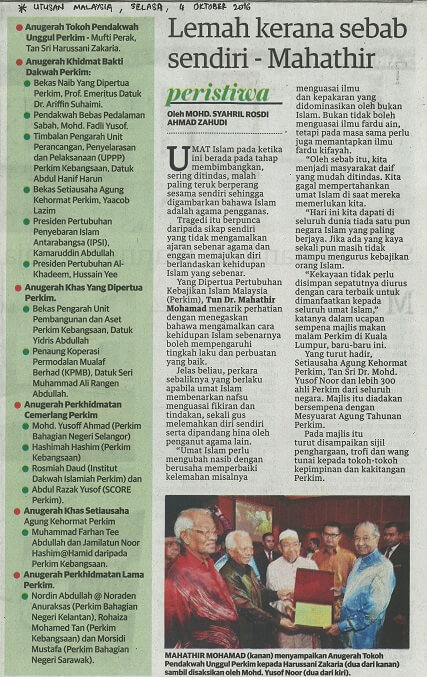 | 7 | 06/10/2016 (Khamis) | Utusan Malaysia | "Perpecahan mazhab, fahaman punca perpecahan umat Islam" |