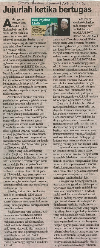 | 1 | 28/10/2016 (Jumaat) | Sinar Harian | "Jujurlah ketika bertugas" |
