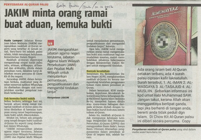 | 5 | 10/10/2016 (Isnin) | Berita Harian | "JAKIM minta orang ramai buat aduan, kemuka bukti" |