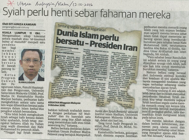 | 4 | 12/10/2016 (Rabu) | Utusan Malaysia | "Syiah perlu henti sebar fahaman mereka" |