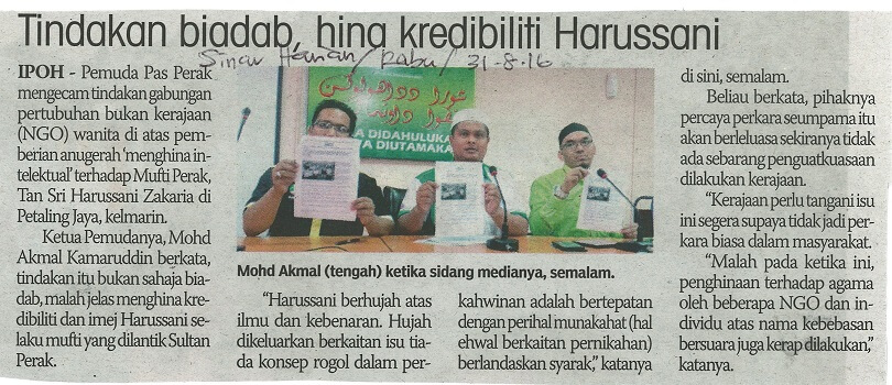| 3 | 31/08/2016 (Rabu) | Sinar Harian | "Tindakan biadab, hina kredibiliti Harussani" |