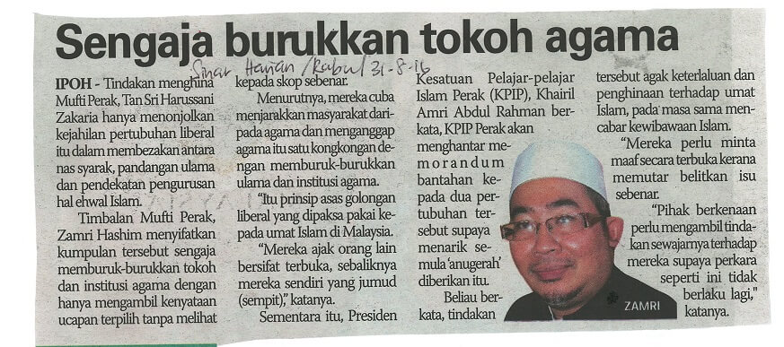 | 2 | 31/08/2016 (Rabu) | Sinar Harian | "Kecam penghinaan terhadap Mufti" |