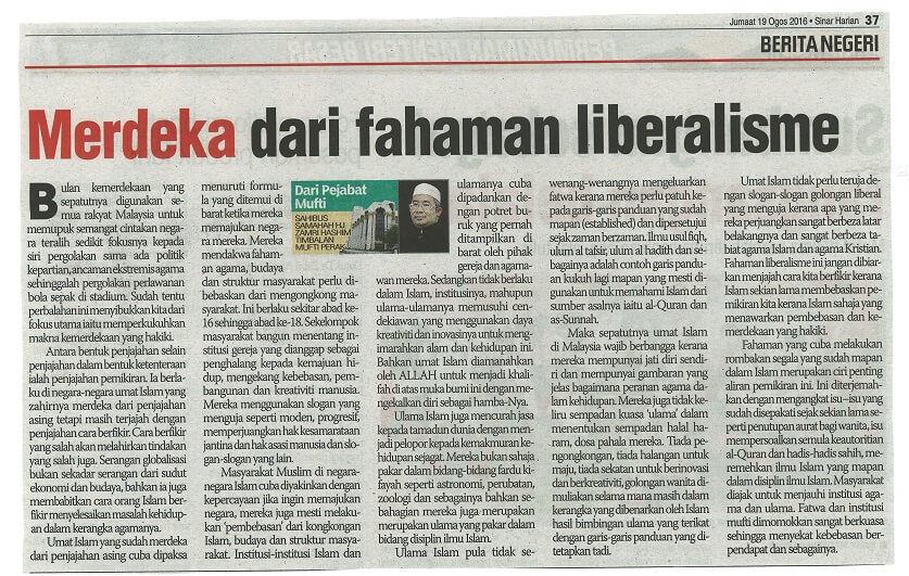 | 5 | 19/08/2016 (Jumaat) | Sinar Harian | "Merdeka dari fahaman liberalisme" |