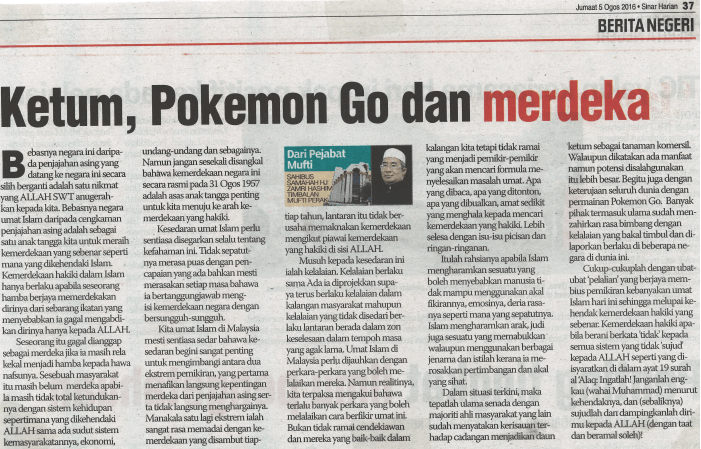 | 6 | 05/08/2016 (Jumaat) | Sinar Harian | "Ketum, Pokemon Go dan Merdeka" |