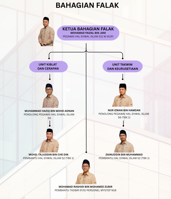 Membantu Mufti dalam menguruskan isu-isu Falak, menginstitusikan Bahagian Falak sebagai pusat rujukan, pendidikan dan penyelidikan dalam isu-isu yang berkaitan ilmu Falak serta melahirkan masyarakat celik Falak dan ahli Falak yang berkemahiran tinggi.