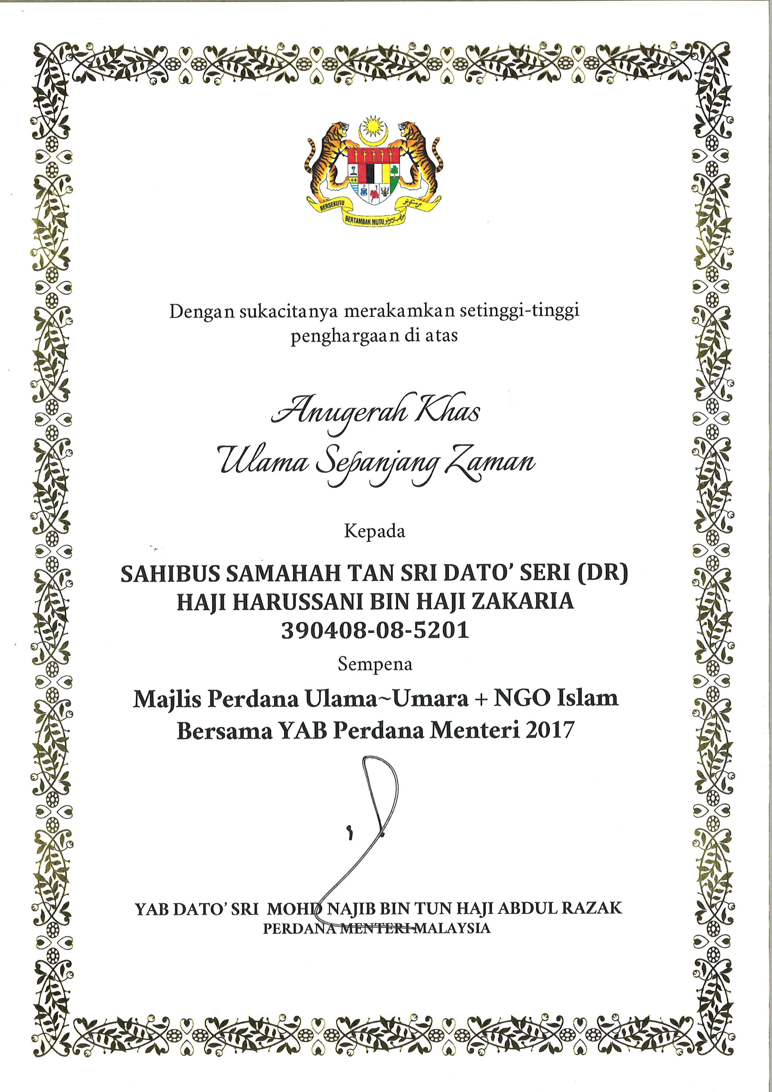 Anugerah Khas Ulama’ Sepanjang Zaman Di Majlis Perdana Ulama – Umara + NGO Islam Bersama YAB Perdana Menteri 2017